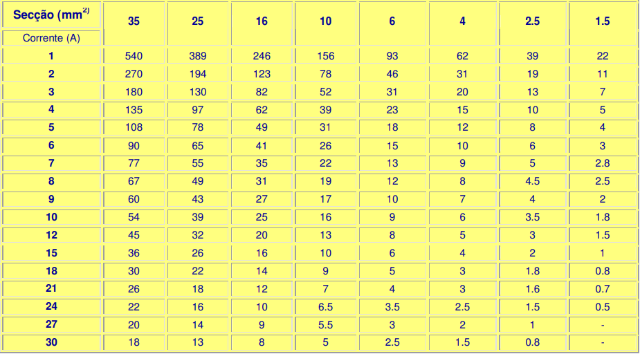 Na coluna à esquerda escolhe-se a corrente pretendida. Nessa mesma linha procura-se a distância que o referido cabo percorrerá e lê-se na parte superior da respectiva coluna a secção de cabo correspondente.