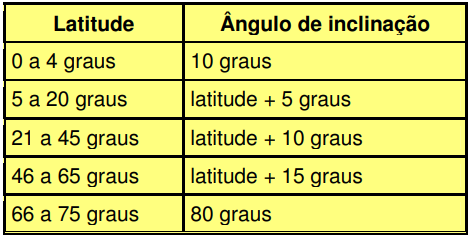 Para conseguir um melhor aproveitamento da radiação solar incidente, os módulos deverão estar inclinados em relação ao plano horizontal num ângulo que variará conforme a latitude da instalação. Recomenda a adoção dos seguintes ângulos de inclinação: