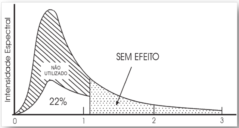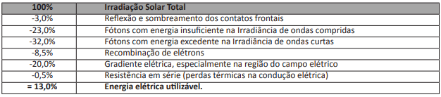 Fótons com energia superior ou inferior à necessidade geram calor desnecessário, que diminui a eiciência da célula fotovoltaica. Veja na tabela abaixo o balanço energéico de uma célula fotovoltaica de silício cristalino: