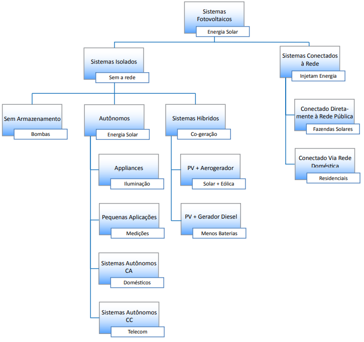 Os sistemas fotovoltaicos são classificados de acordo à forma como é feita a geração ou entrega da energia elétrica em: