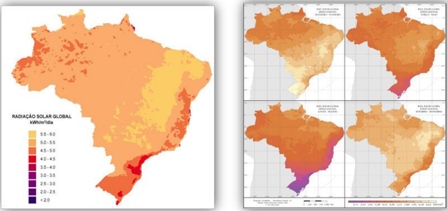 No Brasil temos dois principais estudos sobre a radiação solar em território brasileiro: o “Atlas Solarimétrico do Brasil” – produzido pelo CRESESB (Centro de Referência em Energia Solar e Eólica Sergio de Salvo Brito); e o “Atlas Brasileiro de Energia Solar” – produzido pela Universidade Federal de Santa Catarina em conjunto/para com o Projeto SWERA.