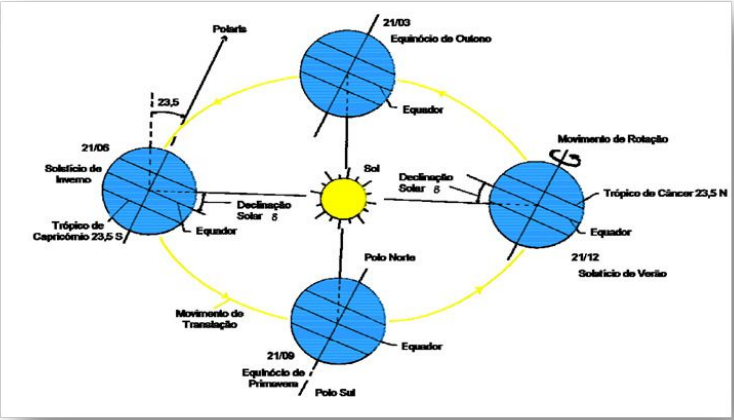 A terra se move em uma órbita elíptica em torno do sol e o eixo de rotação da Terra forma um ângulo de 23,5° com a normal ao plano da elipse da órbita da Terra. Esse ângulo é o responsável pela duração do dia e da noite nas distintas estações do ano, e também é o responsável pela variação da elevação do sol no horizonte à mesma hora, ao longo do ano.