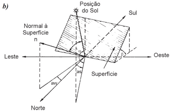 Ângulo Azimutal do Sol (as ):É o ângulo entre a projeção dos raios solares no plano horizontal e a direção Norte-Sul. Tem as mesmas convenções que o Ângulo Azimutal de Superfície.
