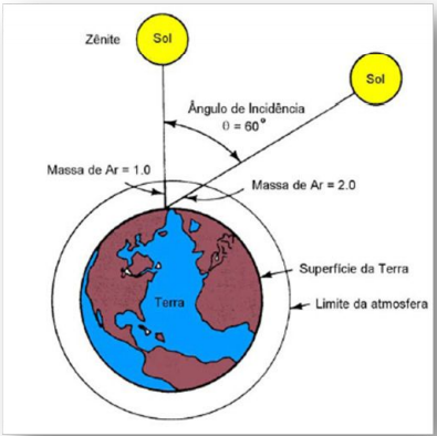 A camada atmosférica será mais ou menos espessa, de acordo à elevação do sol, no momento da medição. Essa espessura é medida através de um coeficiente chamado Massa de Ar (AM). A massa de ar influencia através dos efeitos de absorção e dispersão (Rayleigh e Mie), por isso, quanto mais elevado o sol estiver no céu, menores serão os efeitos da camada atmosférica. É importante salientar que a poluição atmosférica potencializa esses efeitos de absorção e dispersão.