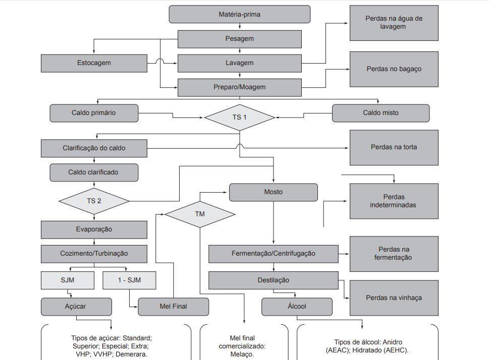 Também podemos perceber as macro-perdas envolvidas na produção de açúcar e álcool (perdas na água de lavagem, no bagaço, na torta, na fermentação, na vinhaça e perdas indeterminadas), bem como o local onde estas perdas são geradas, entretanto, o mais importante na Figura 2 é perceber o local onde as mudanças de processo podem acontecer, ou seja, os pontos TS 1, TS 2, TM, SJM, 1-SJM, que referem-se aos desvios de fluxo dos produtos semi-acabados no processo.