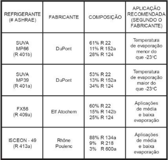 R-409A - Mistura de fluidos refrigerantes tais como R-22, R- 142b e R-124, tem propriedades similares ao R-12 e pode ser utilizado com óleo lubrificante mineral, poliolester e aquilbenzeno.