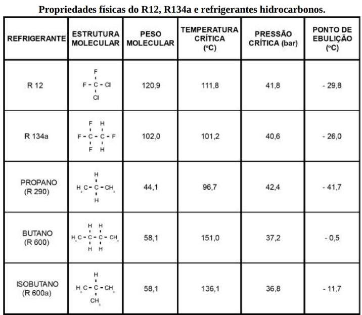 Durante os últimos anos, vários refrigerantes alternativos foram avaliados e o R134a, por apresentar propriedades físicas e termodinâmicas rela tivamente semelhantes às do R12 e por não conter Cloro, tem sido considerado o substituto do R12 nas suas aplicações. Mais recentemente, outro fator ambiental, não menos importante que a destruição da camada de ozônio, tem sido considerado: o potencial de aquecimento global, mais conhecido como efeito estufa. Dentre os refrigerantes alternativos que atendem ambas características ambientais, estão os hidrocarbonos. Estes refrigerantes não tinham até então sido considerados uma alternativa à substituição do R12, pois são inflamáveis. Na tabela a seguir são apresentadas as principais propriedades físicas dos refrigerantes hidrocarbonos comparadas às do R12 e R134a.
