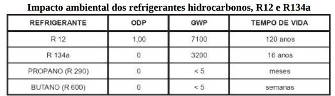 Observa-se na tabela acima que o refrigerante R134a, não destrói a camada de ozônio (ODP = 0). Tal característica deve-se à ausência de cloro nas suas moléculas. Entretanto os refrigerantes propano e butano exercem efeito desprezível (GWP < 5) sobre o aquecimento da Terra, ao contrário do R12 e R134a. Outro fator ambiental favorável aos refrigerantes propano e butano é seu menor tempo de vida na atmosfera. Os principais impactos de cada refrigerante hidrocarbono sobre o compressor e o dispositivo de expansão dos sistemas de refrigeração, baseados na análise teórica do ciclo ASHRAE, são resumidos na tabela abaixo.