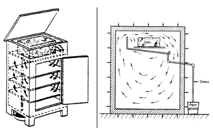 A utilização do gelo natural levou a criação, no princípio do século XIX, das primeiras geladeiras. Tais aparelhos eram constituídos simplesmente por um recipiente, quase sempre isolado por meio de placas de cortiça, dentro do qual eram colocadas pedras de gelo e os alimentos a conservar, ver figura abaixo. A fusão do gelo absorvia parte do calor dos alimentos e reduzia, de forma considerável, a temperatura no interior da geladeira.