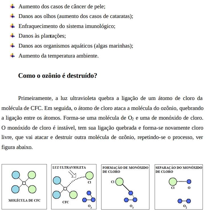 O ozônio é formado quando as moléculas de oxigênio absorvem parte da radiação ultravioleta proveniente do sol, ocasionando a separação das moléculas em dois átomos de oxigênio. Estes átomos por sua vez, juntam-se com outras moléculas de oxigênio, formando assim o ozônio (O3), que contém três átomos de oxigênio. Aproximadamente 90% do ozônio da terra está localizado em uma camada natural, logo acima da superfície terrestre conhecida como estratosfera. Esta camada natural atua como um escudo protetor contra a radiação ultravioleta. A primeira preocupação sobre a provável destruição da camada de ozônio pelos CFC’s foi levantada com a publicação da teoria de que os átomos de cloro liberados pelos CFC’s poderiam migrar até a estratosfera, destruindo as moléculas de ozônio (Molina e Rowland, 1974), conforme mostra a figura abaixo.