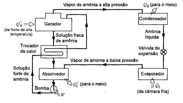 O vapor de amônia a baixa pressão, que deixa o evaporador, entra no absorvedor onde é absorvido pela solução fraca de amônia. Esse processo ocorre a uma temperatura levemente acima daquela do meio e deve ser transferido calor ao meio durante esse processo. A solução forte de amônia é então bombeada através de um trocador de calor ao gerador (onde são mantidas uma alta pressão e uma alta temperatura). Sob essas condições, o vapor de amônia se separa da solução em conseqüência da transferência de calor da fonte de alta temperatura. O vapor de amônia vai para o condensador, onde é condensado, como no sistema de compressão de vapor, e então se dirige para a válvula de expansão e para o evaporador. A solução fraca de amônia retorna ao absorvedor através do trocador de calor. A característica particular do sistema de absorção consiste em requerer um consumo muito pequeno de trabalho porque o processo de bombeamento envolve um líquido. Isso resulta do fato de que, para um processo reversível, em regime permanente e com variações desprezíveis de energias cinéticas e potencial, o trabalho é igual a –v.(P2-P1) e o volume específico do líquido (v) é muito menor que o volume específico do vapor. Por outro lado, deve-se dispor de uma fonte térmica de temperatura relativamente alta (100 a 200 °C). O equipamento envolvido num sistema de absorção é um tanto maior que num sistema de compressão de vapor e pode ser justificado economicamente apenas nos casos onde é disponível uma fonte térmica adequada e que, de outro modo, seria desperdiçada.
