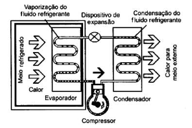 Pode-se entender a lógica de funcionamento dos principais sistemas de refrigeração atuais estudando o funcionamento de um refrigerador doméstico comum, também conhecido como sistema de compressão mecânica de vapor (figura ao lado). Ele funciona a partir da aplicação dos conceitos de calor e trabalho, utilizando-se de um fluido refrigerante. O fluido refrigerante, como dito anteriormente, é uma substância que, circulando dentro de um circuito fechado, é capaz de retirar calor de um meio enquanto se vaporiza a baixa pressão. Este fluido entra no evaporador a baixa pressão, na forma de mistura de líquido mais vapor, e retira energia do meio interno refrigerado (energia dos alimentos) enquanto passa para o estado de vapor. O vapor entra no compressor onde é comprimido e bombeado, tornando-se vapor superaquecido e deslocando-se para o condensador, que tem a função de liberar a energia retirada dos alimentos e a resultante do trabalho de compressão para o meio exterior. O fluido, ao liberar energia, passa do estado de vapor superaquecido para líquido (condensação) e finalmente entra no dispositivo de expansão, onde tem sua pressão reduzida, para novamente ingressar no evaporador e repetir-se assim o ciclo. Esse processo é ilustrado através da figura a seguir.