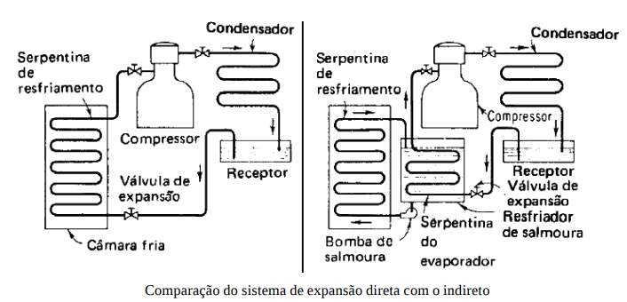 De maneira similar funcionam também os grandes sistemas de refrigeração, como câmaras frigoríficas. O que difere os sistemas pequenos dos de grande porte é o número de unidades compressoras, evaporadoras, de expansão e condensadoras envolvidas, que nestes últimos podem ser múltiplos, bem como o sistema de controle, que pode alcançar elevada complexidade.