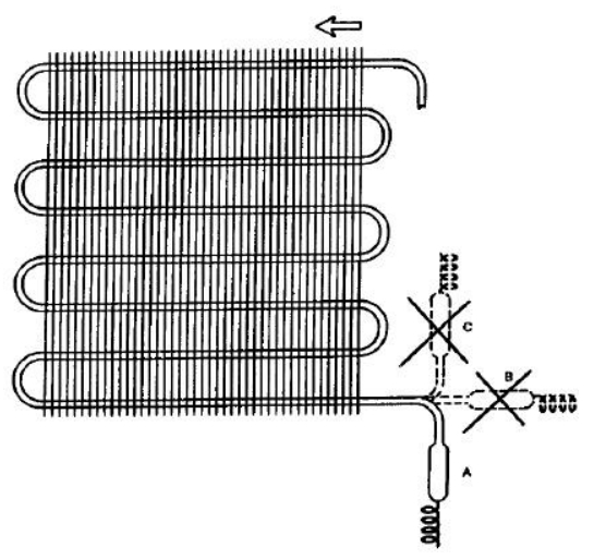 - Pode também estar ocorrendo a obstrução parcial da tubulação, que normalmente ocorre devido a uma brasagem mal feita (excesso de material de adição), partículas sólidas provenientes de deterioração do dessecante do filtro secador ou dobra excessiva de tubo. Deve-se verificar com cuidado, inclusive os pontos críticos como filtro secador (telas) e a entrada do tubo capilar;
