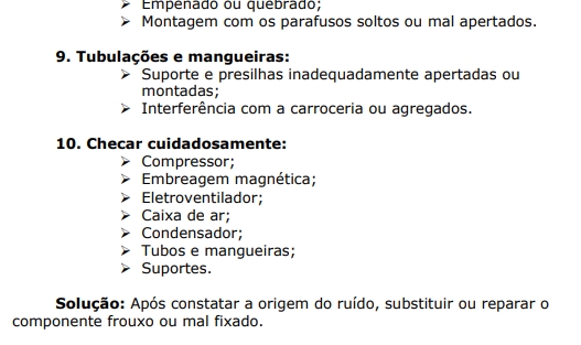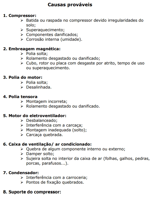 Nota: Todo ruído gerado na carroceria ou motor são amplificados e seguem pelas tubulações para o interior do habitáculo. Este ruído pode ter as mais diversas origens e por inúmeras vezes é diagnosticado incorretamente, considerando-se o compressor como único causador da falha.