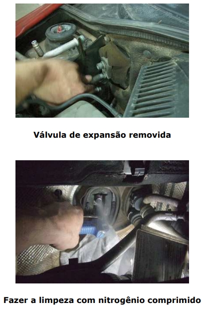 No caso do condensador com o filtro secador interno, do tipo cartucho, se não houver o filtro cartucho para venda separada, recomenda-se a troca completa do condensador. Isso deve ser considerado num orçamento, pois a variação de preço entre trocar ou não trocar um condensador é alta. Atenção para não comprometer o orçamento! Os itens mangueira, trecho de tubulação, condensador e evaporador devem ser limpos separadamente. Ao limpar o evaporador o correto é efetuar a retirada da válvula de expansão. Em alguns veículos ela fica alojada em locais de difícil acesso, como dentro do painel, por exemplo. Nesses casos é necessária a remoção do painel, sempre fazendo a passagem do fluido nos dois sentidos (fluxo e contra fluxo ou retro lavagem). Se não for retirada, a válvula de expansão pode dificultar e até comprometer a limpeza. Se o sistema possuir tubo de expansão, este deve ser limpo ou substituído. Em alguns casos, para a limpeza do evaporador e válvula de expansão, deve ser orçada a remoção do painel, pois o serviço de limpeza do sistema pode ser em vão, considerando o evaporador repleto de óleo contaminado e a válvula de expansão travada devido às impurezas internas.