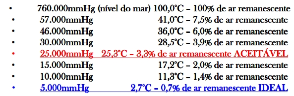Abaixo seguem algumas referências de pressão absoluta de vácuo e o ar remanescente no sistema e à temperatura de evaporação da umidade nesta pressão, que cujo nome disse MÍCRONS DE MERCÚRIO: