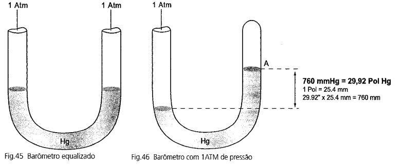 O mícron é uma unidade de medida linear. Um mícron é a milésima parte de um milímetro. Os manômetros de medir as pressões nos sistemas de refrigeração são na sua maioria marcados no sistema que usa a polegada de comprimento e a libra de peso. Para se ter uma idéia da proporção do mícron em relação aos nossos manômetros, basta dizer que um mícron é igual a 1 parte de 25000polegadas, ou então que são necessários 255.400mícrons para fazer uma polegada. O tubo da Fig. 45 está equilibrado com a pressão de 1atm nas duas extremidades. Quando não se aplica pressão em uma das extremidades, a pressão atmosférica vai atuar fazendo com que o mercúrio se movimente no sentido da pressão aplicada. Sendo a pressão mostrada de 1atm, é portando o zero do manômetro. Na Fig. 46 quando o manômetro composto (azul) está marcando abaixo de zero, ele está dando a pressão negativa em polegadas de vácuo. Isto quer dizer que a nossa coluna de mercúrio da ilustração está começando a passar para baixo do ponto A.