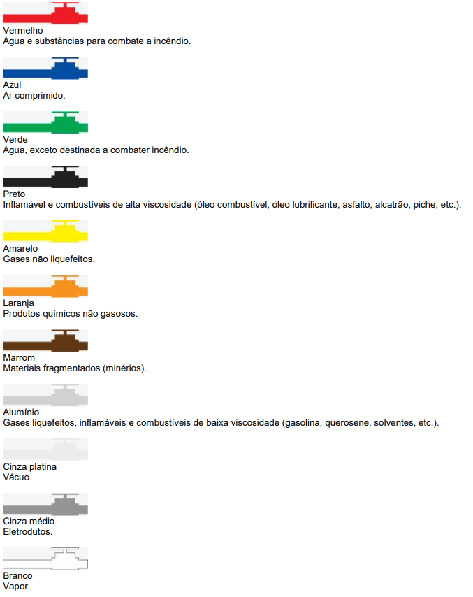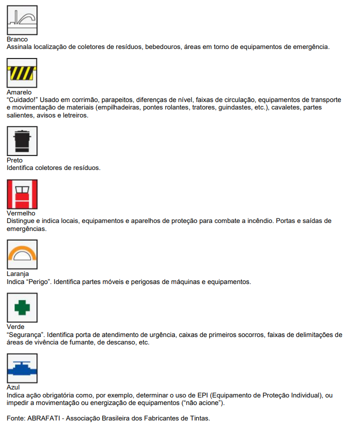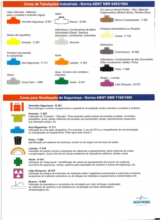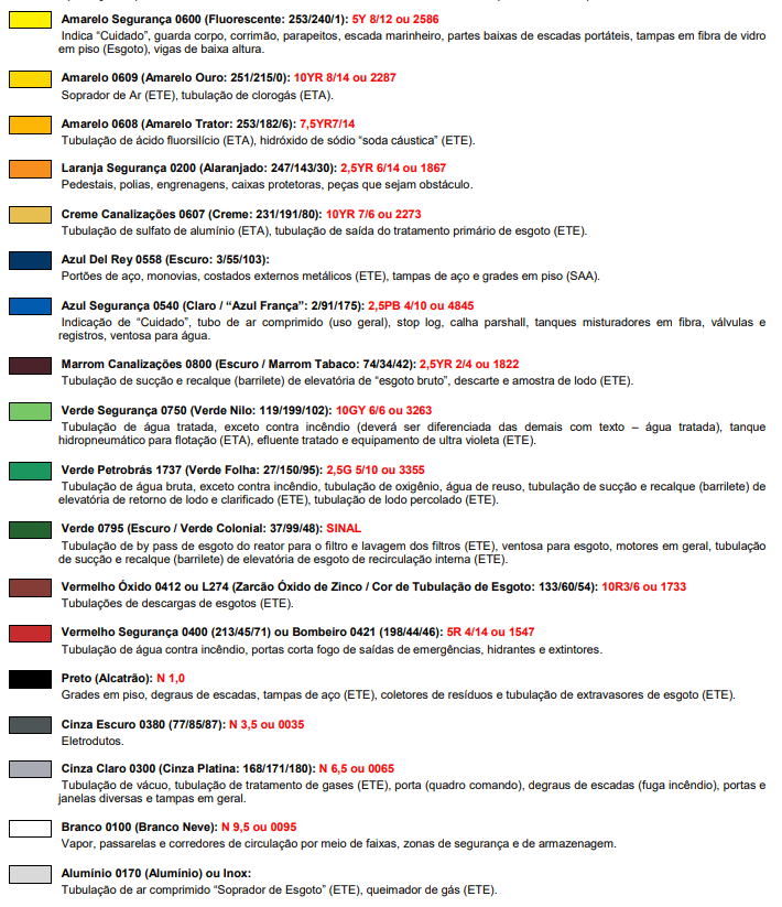 OBS: Cor da Tinta (nome de mercado: RGB-vermelho/verde/azul): nº padrão ou petrobrás (quando existir) 00 . Aplicações (demais detalhes, consultar a NR 26 e modelos usados pelo mercado).