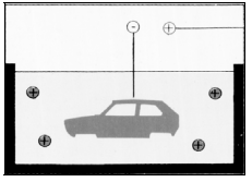 A peça é ligada ao polo positivo e a célula, ao polo negativo.