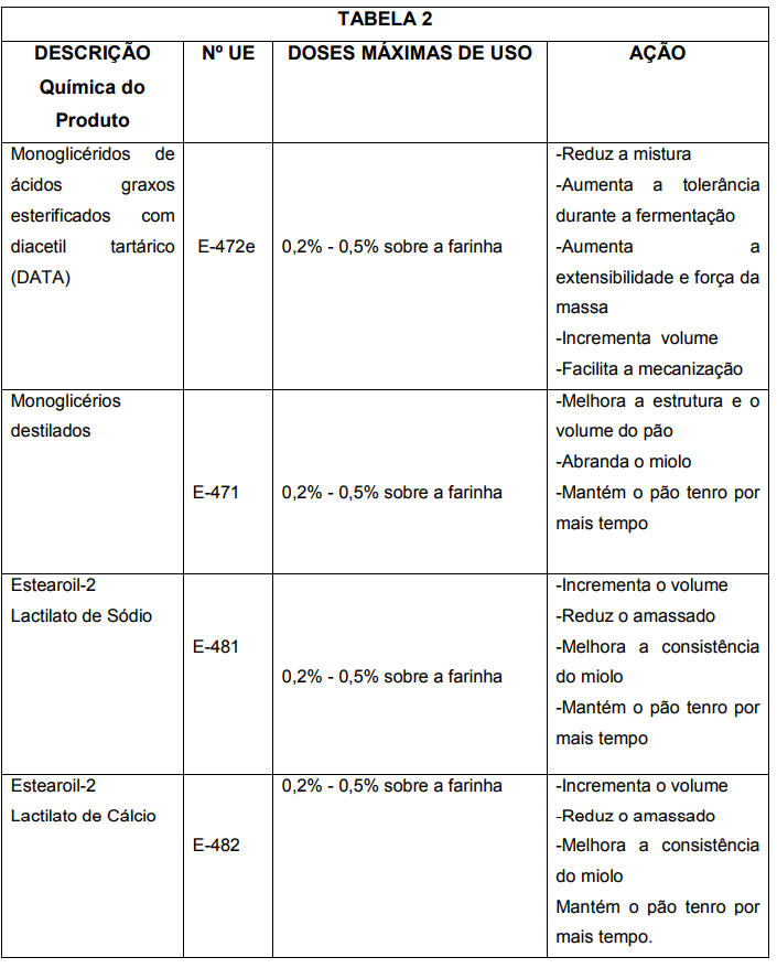 O emulgente mais comum para conseguir esse fim é o mono glicérido de ácidos graxos esterificados com diacetil - tartárico. ({DATA} E-472e) em doses recomendadas entre 2 e 6 g por quilo de farinha. Este emulgente junto com o ácido ascórbico e as enzimas alfa - amilases compõem o melhorador completo que normalmente se emprega na padaria.
