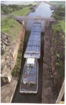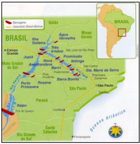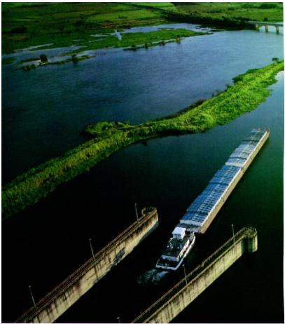 No Brasil, o melhor exemplo de rio canalizado é a hidrovia Tietê–Paraná, com as barragens e eclusas de Barra Bonita, Bariri, Ibitinga, Promissão, Nova Avanhandava e Três Irmãos, no Rio Tietê; e de Jupiá e Porto Primavera, no Rio Paraná, que permite a navegação até a hidrelétrica de Itaipu (figura 3).