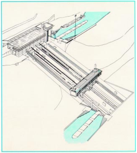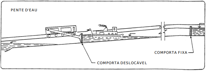 É um processo novo. A cuba móvel e os equipamentos mecânicos, muito onerosos, são substituídos por um canal inclinado, onde a embarcação circula em um prisma de água, empurrada por um veículo sobre pneumáticos (figura 7). A rampa líquida assegura a continuidade da hidrovia, não sendo mais necessário a embarcação deixar o canal para entrar numa cuba.