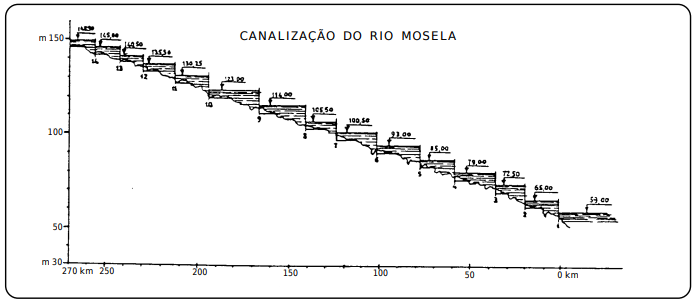 Assim, a rampa líquida consiste em um canal de seção uniforme, com declividade que pode alcançar até 5%, no qual uma comporta móvel desloca um prisma de água onde flutua a embarcação, como se pode ver na figura 7. Quanto ao custo, especialistas consideram que, acima de 20 metros de desnível, a rampa líquida é mais vantajosa que a eclusa, abrindo novas perspectivas para canalização de rios e interligação de bacias. Para canalização do rio Mosela, afluente do Reno, na extensão de 270 km, vencendo um desnível de 90 metros, foram construídas 14 barragens (figura 8), cada uma com usina elétrica, uma pequena eclusa para embarcações de recreio, escada de peixe, uma rampa líquida para barcos de esporte e a eclusa principal, medindo 170 m x 12 m x 3,5 m. Posteriormente, a canalização prosseguiu para montante, em mais 70 km.