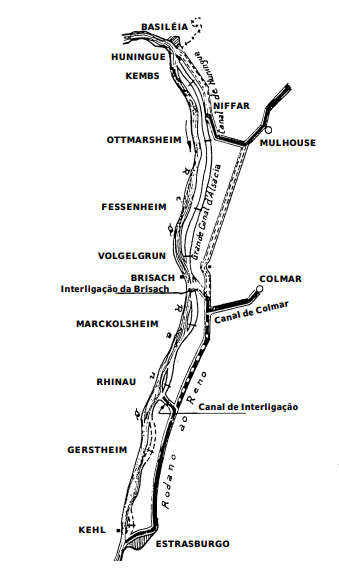 Os canais podem ser definidos como vias navegáveis interiores completamente artificiais, em oposição às vias navegáveis naturais. Há duas classes principais de canais: os canais laterais e os canais de partilha. Os canais laterais são usados quando o melhoramento de um trecho do rio é de tal modo difícil ou oneroso que se torna preferível construir lateralmente um canal inteiramente artificial, que pode ser dividido em vários planos d’água, ligados por eclusas ou elevadores. A figura 9 indica o Grande Canal da Alsácia, canal lateral do Rio Reno, concluído na década de 1970.