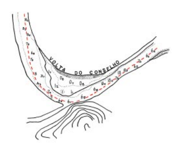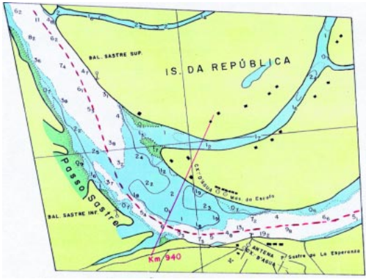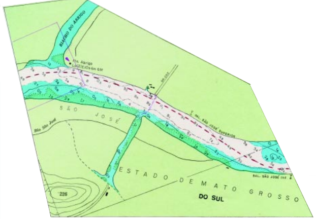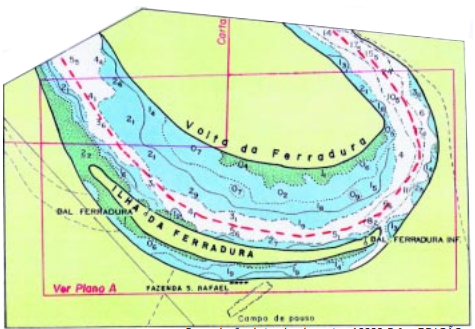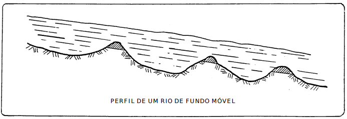 O perfil batimétrico do canal navegável em um rio de fundo móvel toma o aspecto de uma sucessão de longos trechos com boas profundidades, separados por curtos trechos de baixa profundidade (“passos”), que dificultam a navegação e limitam os calados das embarcações. A figura 1 representa a forma geral observada e, em hachura, os cortes que seriam abertos por dragagem. Esses baixios se recompõem durante cada enchente, de modo que a dragagem tem que ser permanente.