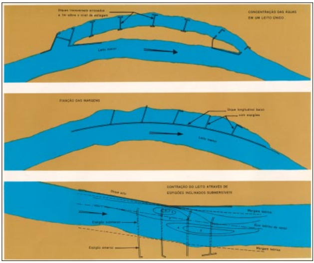 Sua aplicação exige um conhecimento muito detalhado do rio. A figura 11 mostra várias técnicas de melhoramento em corrente livre para concentração das águas em um leito único, fixação das margens e contração e aprofundamento do leito. Este método foi, também, empregado no Reno, no Elba, no Loire e, mais recentemente, no Mississipi. Em todos os casos, entretanto, os trabalhos de regularização não trouxeram os resultados esperados.