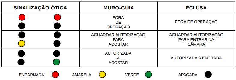 (a) As ordens de movimentações das embarcações, nas manobras de acostagem ao muro-guia e entrada e saída da eclusa, serão informadas pelo Operador da Eclusa através do equipamento rádio, em canal perfeitamente definido, sendo posteriormente confirmadas pelos seguintes sinais luminosos, dispostos no muro-guia e na entrada da eclusa;