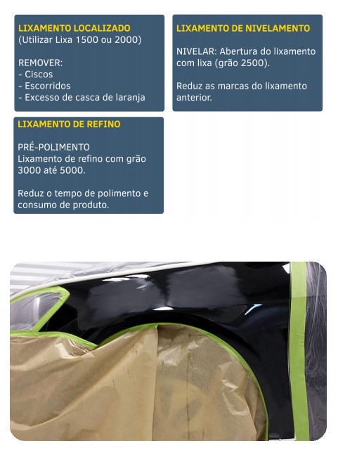 Durante este procedimento, os grãos das lixas utilizadas podem variar de acordo com o defeito a ser corrigido. Exemplo: 1500, 2000, 2500, 3000, 5000.