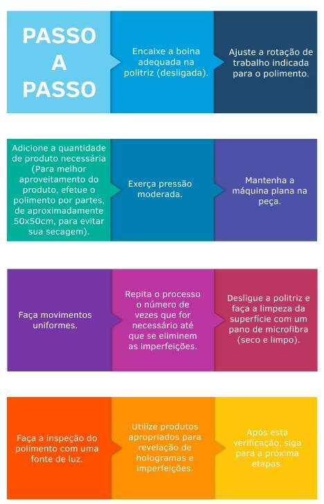 O objetivo é eliminar todos os riscos de lixa, aplicando uma pequena quantidade de polidor abrasivo na região a ser polida. Esse processo pode ser manual ou mecânico.