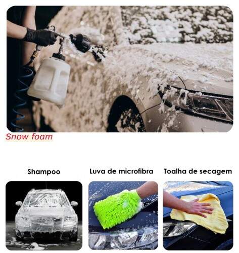 - 3° Etapa: Com a snow foam conectada ao compressor, jogue a espuma em toda parte externa do carro incluindo as rodas e aguarde alguns minutos para o que o produto faça efeito facilitando a remoção de sujeiras impregnadas.