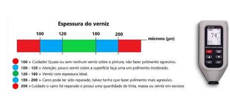 Medição de espessura: Utilize um Medidor de Espessura para realizar a leitura da espessura de tinta que se encontra no veículo. Uma faixa segura de trabalho é entre 120 a 180 microns (μm). d.