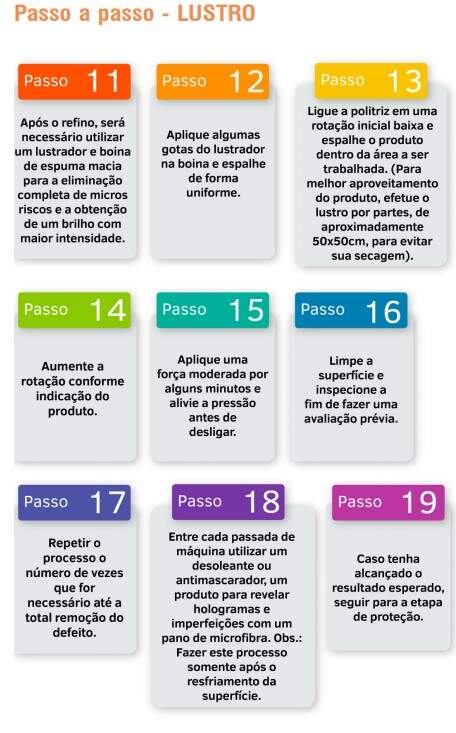 Lustro: Essa etapa busca o acabamento final do polimento, corrigindo defeitos mais suaves, promovendo mais brilho para pintura. Possui pouca abrasividade e alta capacidade de acabamento. O lustro vai devolver e realçar o brilho intenso do verniz.
