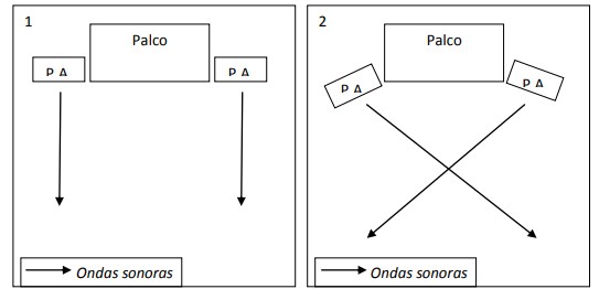 Qual delas você acha que é a montagem certa? Bom o melhor esquema é o nº 02 que contém um “X” feito pelas ondas sonoras no meio do ambiente assim proporcionando que todos ouçam com a mesma qualidade; usando o esquema nº01, as pessoas que estão no meio entre as duas caixas irão ouvir um som meio estranho com pouca qualidade.