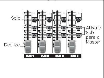 As saídas Subgrupos ou Sub Máster, são opções que o mixer oferece para facilitar a mixagem de um programa sonoro. Imaginem uma apresentação do Diante do Trono que necessite de um mixer de 52 canais para realizar a sua mixagem. Para fazer uma melhor divisão antes de chegar ao Máster ou ir diretamente ao amplificador individualmente cada Sub. Observe como a divisão é feita para Ter um som de boa qualidade e bem audível, já penso a guitarra, maior que a voz ou somente ouvir a bateria parecendo uma escola de samba só tem bateria e batuques e nada de ouvir vocal.