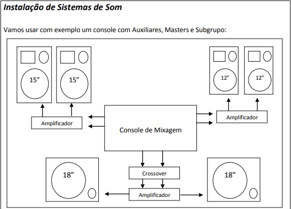 “Para ligar os cubos de 18” que seriam as subgraves ou Subwoofer tiramos o som do subgrupo e passamos ao Crossover (Aparelho que define a freqüência dos graves) e depois para o amplificador e finalmente as caixas.