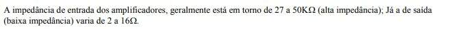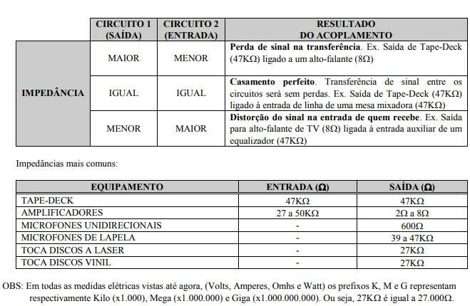 Tipo especial de resistência sendo, portanto, também medida em OHMS (). De forma prática, corresponde à resistência interna que um circuito impõe à corrente elétrica. Varia de acordo com o tipo de circuito e fabricante do equipamento. Abaixo de 1K considera-se baixa impedância; já acima e 10K alta impedância. Muito importante no casamento de dois circuitos elétricos onde: