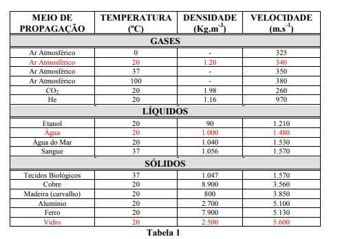 É a propagação de energia mecânica em meio material, sob forma de movimento ondulatório, com pulso longitudinal. Em outras palavras, é uma onda mecânica (que pode ser também eletromecânica) que se propaga fazendo vibrar as moléculas de uma matéria na sua mesma freqüência. Por isso mesmo, a velocidade de propagação do som muda conforme o meio e a temperatura do meio usado. Assim, como o som precisa de um meio para se propagar, ele não existe no vácuo, onde não há matéria. Na Tabela 1, temos a velocidade do som em diferentes meios.