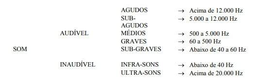 É o conjunto de frequências que formam os sons. São divididos em duas classes: Audíveis e Inaudíveis ao ouvido humano. Numa divisão didática e teórica temos: