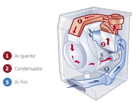Apesar do condensador funcionar apenas com ar quente e frio, cerca de 3 a 6 litros de água são introduzidos no condensador, sempre que seja necessária a sua limpeza..