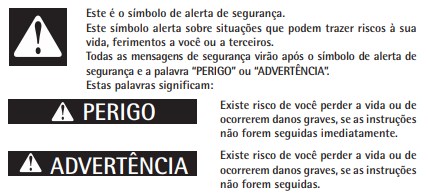 Este é o símbolo de alerta de segurança. Este símbolo alerta sobre situações que podem trazer riscos à sua vida, ferimentos a você ou a terceiros. Todas as mensagens de segurança virão após o símbolo de alerta de segurança e a palavra “PERIGO” ou “ADVERTÊNCIA”. Estas palavras significam: