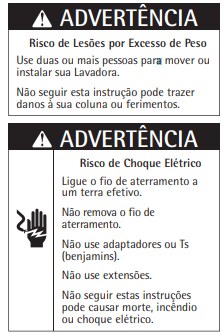 ADVERTÊNCIA: Para evitar risco de incêndio, choque elétrico ou ferimentos, quando usar sua Lavadora, observe as precauções relacionadas abaixo: • Siga rigorosamente as instruções de instalação para garantir a segurança de toda a família. • Leia todas as instruções antes de começar a usar a Lavadora. • A Lavadora foi desenvolvida exclusivamente para o uso doméstico. • Não é permitido o manuseio da Lavadora por crianças e pessoas não-capacitadas, sendo necessária a atenção do responsável sempre que existirem crianças por perto, durante a instalação e quando o produto estiver em funcionamento • Não instale ou guarde a Lavadora em local sujeito a chuvas ou ao mau tempo. • Não repare ou troque qualquer parte de sua Lavadora e nem faça nenhum reparo que não seja explicitamente recomendado neste manual. Para manutenção, entre em contato com a Rede de Serviços Consul. • Observe atentamente as instruções de instalação, principalmente, quanto à voltagem de alimentação e ao aterramento. • Nunca conecte ou desconecte o plugue com as mãos molhadas, para evitar uma descarga elétrica. • Para desconectar sua Lavadora, nunca puxe o cabo de força pelo cabo, apenas pelo plugue, para não danificá-lo.