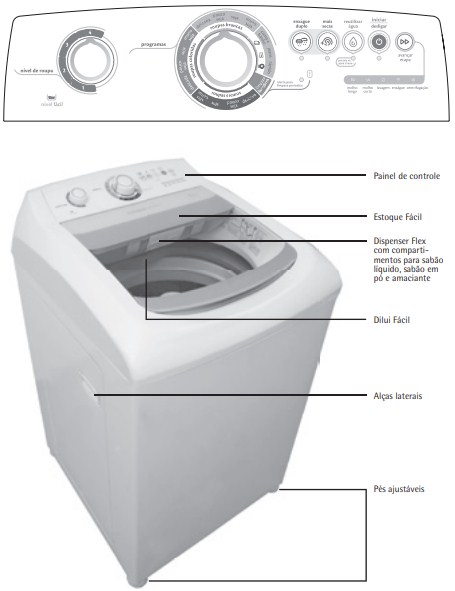 Dilui Fácil Esse sistema melhora a diluição do sabão e do amaciante. No enchimento a água com o produto entrará por baixo do cesto e você conseguirá visualizá-los entrando pelo coletor localizado abaixo do Dispenser Flex. O Dilui Fácil evita manchas nas roupas causadas por excesso de sabão que cai por cima das roupas. Filtro Filtro de fiapos embutido no agitador. O filtro fica imerso em água para aumentar a performance da filtragem, eliminando os fiapos indesejáveis das roupas. Limpe o filtro a cada lavagem. Alças laterais Alças plásticas instaladas nas laterais da Lavadora facilitam a movimentação e desembalagem da mesma. Pés ajustáveis Os pés antiderrapantes garantem mais firmeza para a sua Lavadora. Você deve regulá-los para garantir o melhor nivelamento da sua máquina, evitando trepidações durante a lavagem.