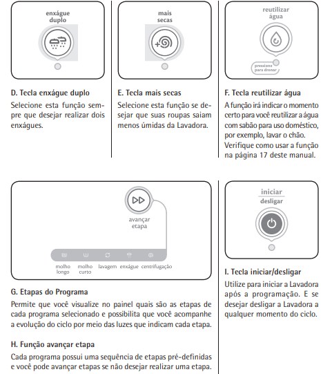 reutilizar água: selecione quando desejar reutilizar a água com sabão do final da etapa de lavagem. Veja o que fazer quando a função está selecionada: • Selecione a função no início da programação ou antes da etapa de enxágue. • Antes de iniciar o enxágue a Lavadora ficará em pausa avisando o momento de reutilizar água (a luz da função e da barra de etapas estarão piscando); • Retire a mangueira de saída do cano de escoamento ou tanque e posicione no recipiente em que você irá armazenar a água para reutilizar. • Pressione novamente a função para a Lavadora drenar a água com sabão e continuar o ciclo. • Após drenar toda água que será reutilizada, reposicione a mangueira de saída de água no local de origem (tanque ou cano de escoamento).