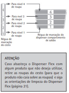 Dispenser Flex Com compartimentos diferentes para uso de sabão em pó e de sabão líquido. Utilize o sabão líquido somente no compartimento removível. Retire este compartimento quando for utilizar o sabão em pó. No compartimento da direita utilize somente amaciante. Para o alvejante, utilize o compartimento localizado no anel do tanque para diluir melhor o produto e evitar manchas. Os produtos serão dispensados no momento certo do ciclo de lavagem.
