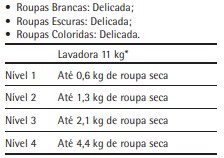 *A capacidade nominal (11 kg) é declarada com base em uma carga de roupas específica para testes. Esta carga é composta por diferentes artigos, cujas características são especificadas pela Portaria do Ministério do Desenvolvimento, Indústria e Comércio Exterior – MDIC, nº 185. Para um bom desempenho da sua Lavadora, o volume das roupas também deve ser considerado, pois existem certos tipos de artigos que, apesar de leves, são volumosos e podem ficar abaixo da capacidade nominal declarada (por exemplo: tecidos sintéticos de modo geral e artigos com enchimento de espuma). Verifique na régua de marcação presente no cesto, a altura que as roupas atingiram. Isso indicará qual nível de roupa deve ser selecionado no painel e a dosagem correta de sabão que deve ser utilizada em cada nível de água. Quantidade máxima de roupa a ser utilizada em cada nível de água:
